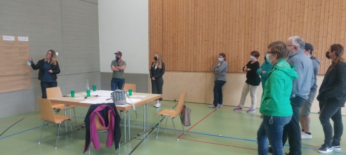 Les habitantes et habitants de Sattel ont répondu à ces questions dans le cadre d’un atelier organisé à la fin de l’été 2021. Les résultats recueillis ont été analysés et discutés par le groupe noyau, avant d’être transformés par un architecte en un concept spatial avec plan de construction. Ces documents ont ensuite été transmis à un groupe de travail chargé de clarifier les étapes suivantes, comme par exemple le type de procédure d’appel d’offres pour la réalisation du bâtiment.
