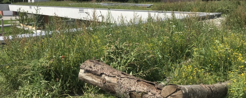 Une toiture végétalisée peut absorber jusqu’à 90% des précipitations annuelles, mais aussi refroidir le bâtiment les jours de canicule. Elle contribue également à protéger la membrane d’étanchéité du toit, dont la durée de vie est ainsi bien plus longue que si elle était recouverte d’une couche de gravier. Mais le véritable bénéfice de ce type de toiture est l’utilisation d’humus local (provenant ici du chantier), la richesse de la vie du sol favorisant la croissance des végétaux. Au bout de trois mois seulement, une végétation dense s’est développée sur le toit, à la plus grande joie des butineurs.