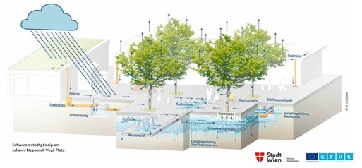 Des problèmes dans la zone urbaine sont entre autres dus au compactage du sol par la circulation routière, à l'apport de sel de déneigement et d'urine de chien, mais aussi au manque d'espace racinaire. Une chose avant tout : Les vieux arbres sont irremplaçables ! Les périodes de végétation extrêmement longues doivent être prises en compte avant d'abattre les vieux arbres sans examiner des alternatives. Le principe de la ville-éponge permet d'offrir aux arbres de bonnes conditions de croissance tout en améliorant la gestion des eaux pluviales. Cela est possible, quand l'eau qui s'écoule des surfaces imperméables n'est pas dirigée vers le système d'évacuation des eaux usées, mais vers l'espace racinaire de l'arbre. Afin de garantir une qualité suffisante de l’eau, seule la classe d'eau F1 (écoulements des trottoirs, des pistes cyclables et des toits des bâtiments) est prise en considération. Ceci sert à la croissance de l'arbre, mais permet aussi de refroidir la température ambiante à travers l'évaporation. Si, en plus du principe de la ville-éponge, on intègre des toitures et des façades végétalisées, on peut obtenir une utilisation en cascade de l'eau de pluie.